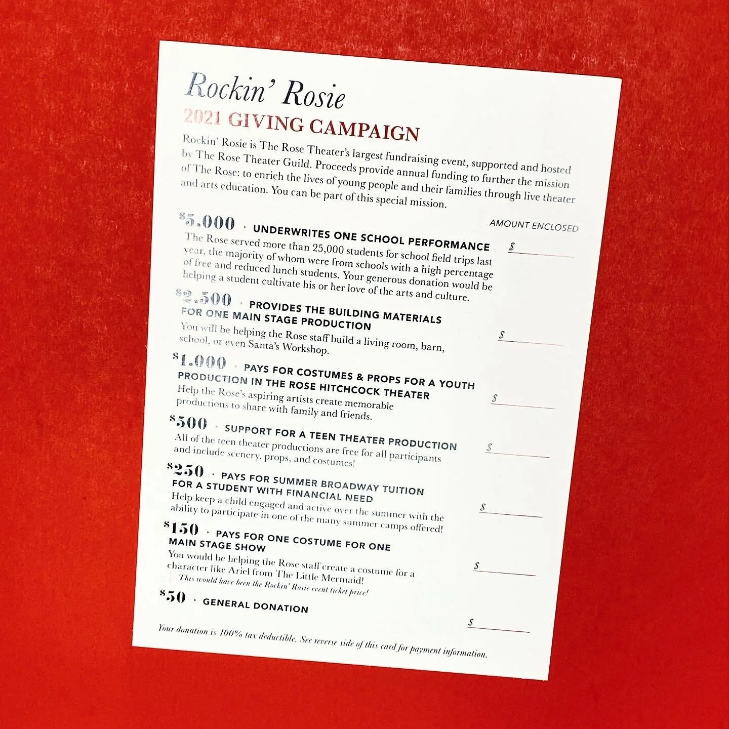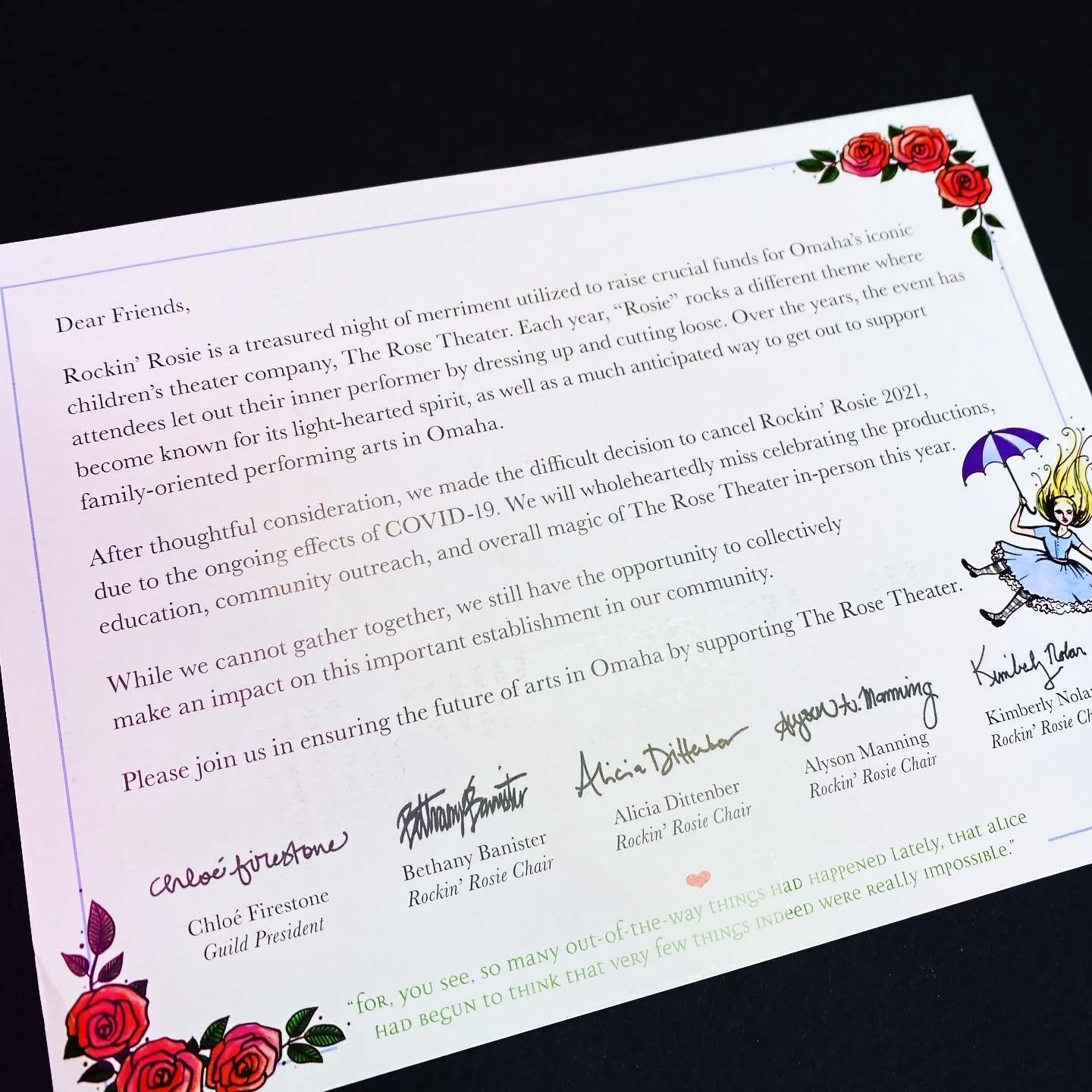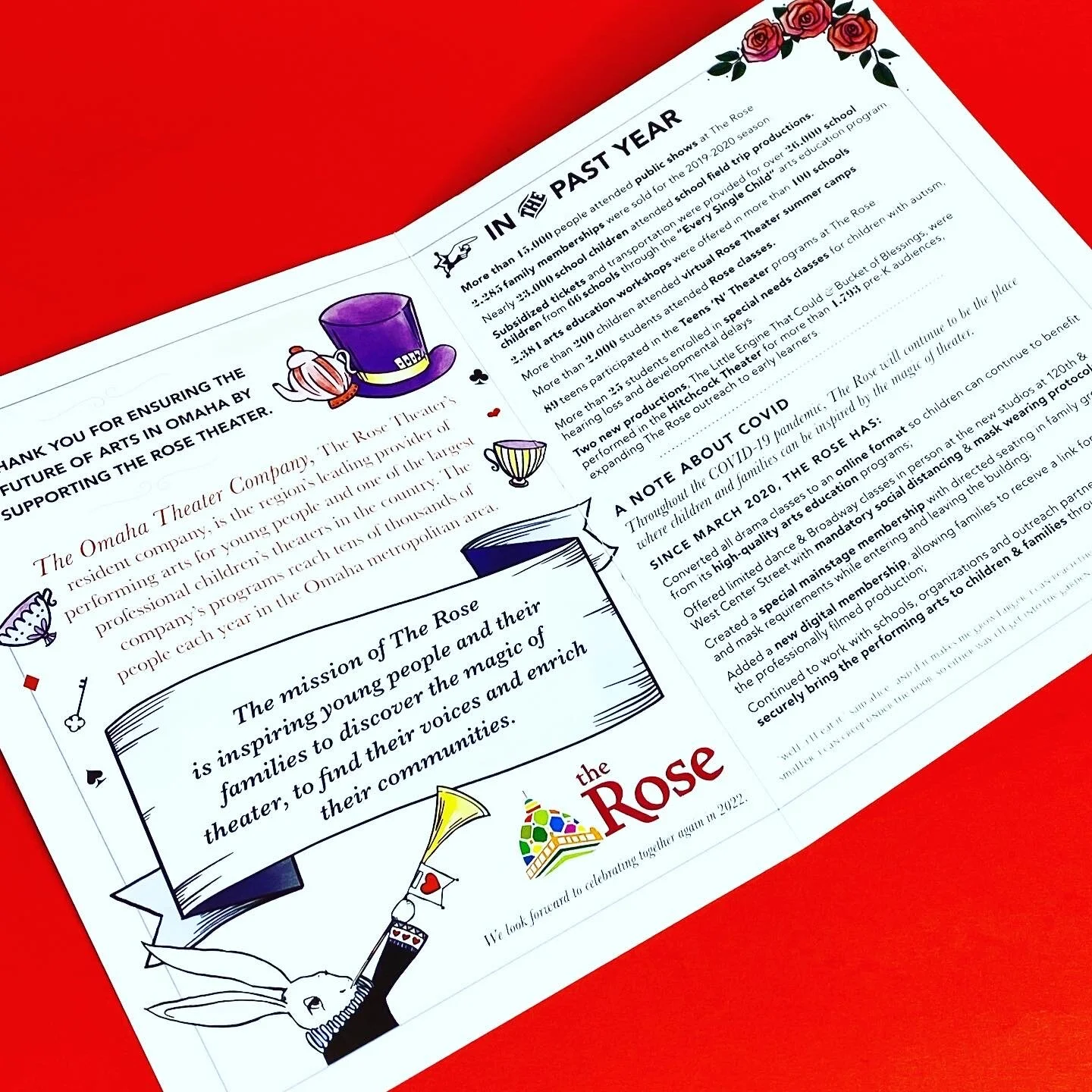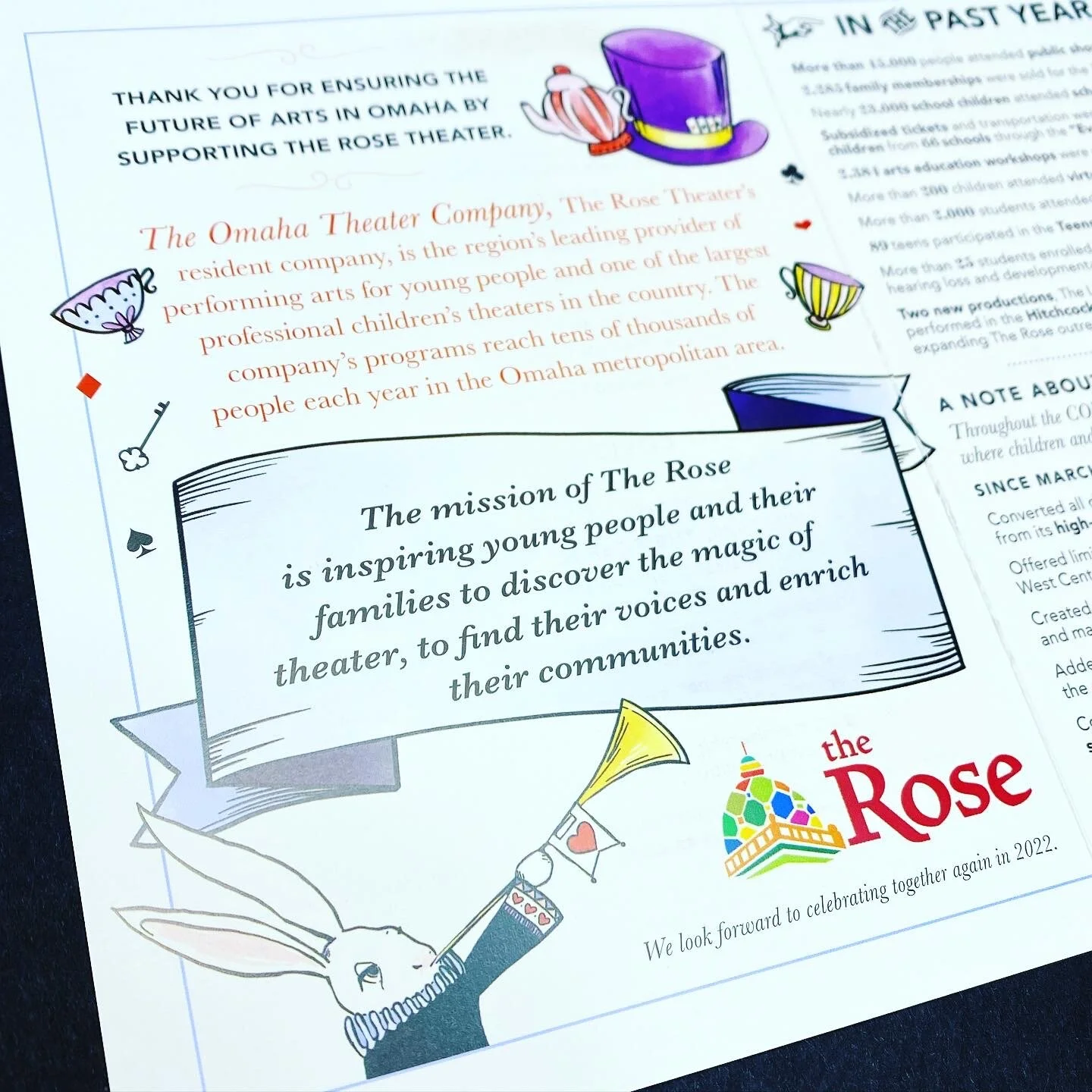 The Rose Theater is a performing arts center and theater group for children and families in Omaha. Their largest annual fundraiser is Rockin’ Rosie. Each year “Rosie” rocks a different theme where attendees let out their inner performer by dressing up and cutting loose. Good Bear has proudly partnered with The Rose Theater Guild to support this event for three years. While 2021 was canceled due to Covid-19, Good Bear still helped make their giving campaign shine through custom illustrated printed and digital materials.